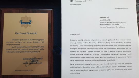 Minister MSWiA, Komendant Główny Policji i prezes Polskiego Komitetu Olimpijskiego wyróżnił specjalnym podziękowaniem pracownika kościerskiej komendy – Leszka Słomińskiego. Podziękowanie uroczyście wręczył 5 stycznia w Warszawie Komendant Główny Policji.