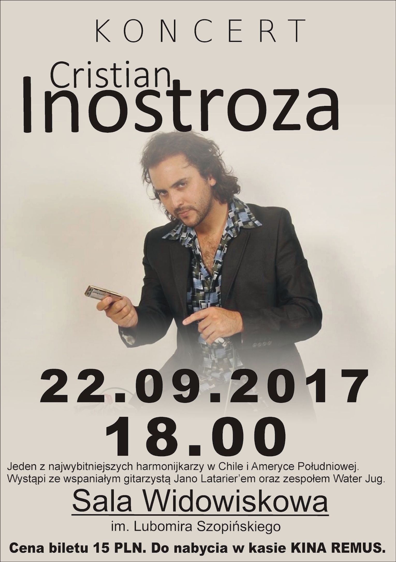 Cristian Inostroza jest jednym z najważniejszych harmonijkarzy w Chile i Ameryce Południowej. Porusza się w wielu stylach min.Jazz, Blues, Swing i chilijska muzyka ludowa. 22 września wystąpi w kościerskiej Sali Szopińskiego.