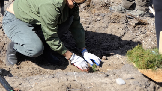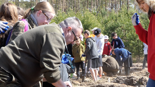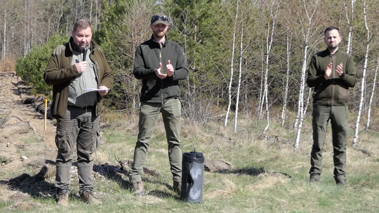 Zadaniem każdego z uczestników było własnoręczne posadzenie drzewka za pomocą kosztura. Polega to na tym,że specjalnym urządzeniem tzw. koszturem wykonuje się otwór w ziemi. Następnie do otworu należy włożyć sadzonkę i docisnąć koszturem.