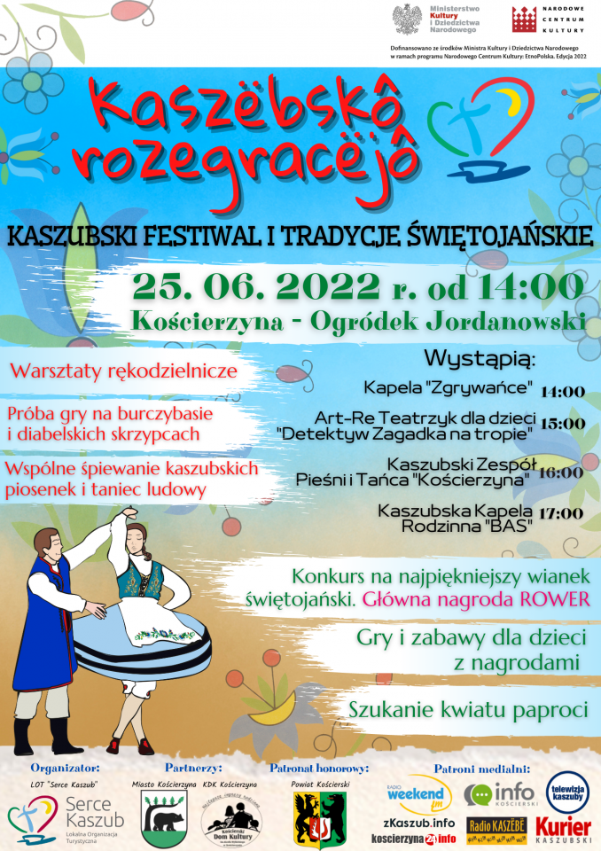 Zapraszamy na KASZUBSKI FESTIWAL i TRADYCJE ŚWIĘTOJAŃSKIE, który odbędzie się w dniu 25 czerwca 2022 r., od godz. 14:00 w Ogródku Jordanowskim. W programie mnóstwo atrakcji m.in. występy kaszubskich zespołów i warsztaty rękodzielnicze. Gry i zabawy dla dzieci oraz konkurs na najpiękniejszy wianek świętojański - główna nagroda ROWER
