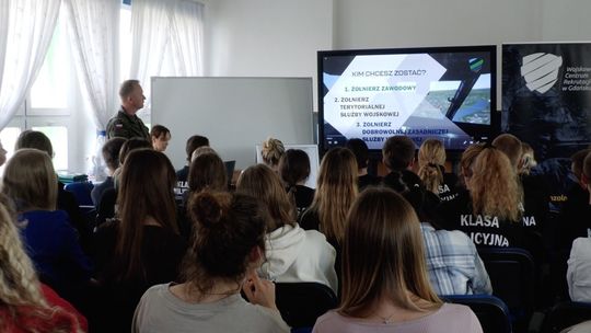 Spotkanie pod nazwą ”Edukacja wojskowa” prowadził z uczniami mjr Piotr Marucki - Szef Wydziału Rekrutacji Wojskowego Centrum Rekrutacji w Gdańsku.
