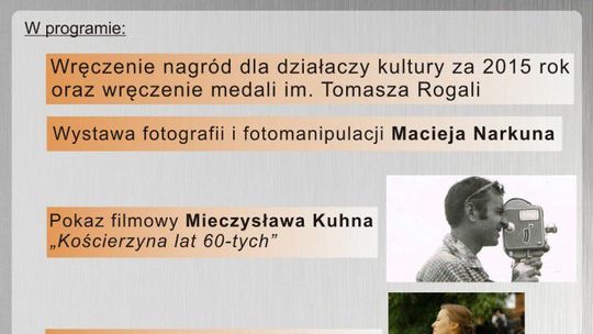 Najważniejsze punktu gali to nagrodzenie ludzi kultury oraz wręczenie medali im. Tomasza Rogali. Ponadto w programie: wystawa fotografii i fotomanipulacji Macieja Narkuna, pokaz filmowy Mieczysława Kuhna „Kościerzyna lat 60-tych” oraz mini recital Anny Federowicz.