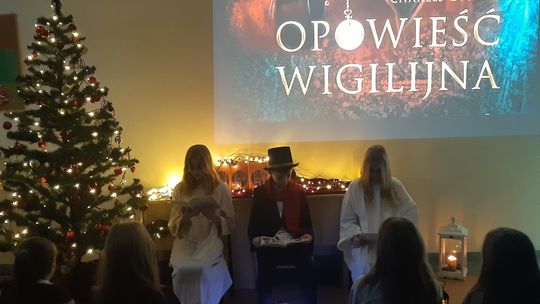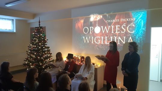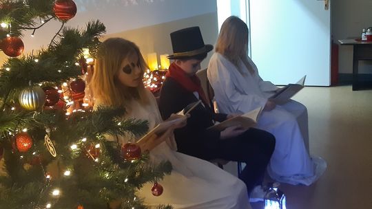 Nie po raz pierwszy uczniowie z naszej szkoły włączyli się w akcję głośnego czytania zorganizowaną przez bibliotekę. Głośno czytali organizatorzy oraz wolontariusze biblioteki przebrani w stroje przedstawiające postacie z powieści Charlesa Dickensa: Blanka Czapiewska kl. 8c, Weronika Zaworska kl.7 i Piotr Datta kl. 6a. Udział w spotkaniu wzięli uczniowie klas III i IV z wychowawcami. Aby poczuć zbliżający się świąteczno-zimowy klimat warto, jak co roku, przypomnieć sobie tę niewielką książeczkę Dickensa tak, aby z optymizmem pozytywnie przygotować się do tego wyczekiwanego wydarzenia. Jej magiczny wpływ utrzymuje się z niemniejszą atrakcyjnością od półtora wieku, prawdopodobnie dlatego, że opowieść ta jest wyrazem ludzkiej tęsknoty za dobrocią i chęcią czynienia dobra. Wymowne są słowa głównego bohatera „Czcić będę odtąd Boże Narodzenie i czynić dobrze nie tylko w tym dniu jednym, ale przez wszystkie dni całego roku”.