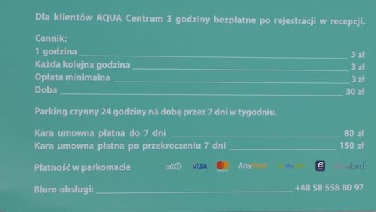 Klienci Aqua Centrum po opłaceniu pobytu zobowiązani będą do podania numeru rejestracyjnego auta w recepcji. Od tego momentu przez 3 godziny będzie dla nich dostępny darmowy parking.