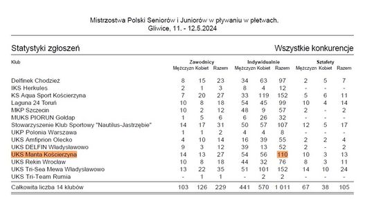 W dniach 11-12 maja 2024 roku w Gliwicach miały miejsce Mistrzostwa Polski Juniorów i Seniorów w pływaniu w płetwach. W zawodach wzięło udział 229 zawodników z całej Polski, którzy rywalizowali na pływalni Olimpijczyk. Reprezentacja UKS Manta Kościerzyna, składająca się z 27 zawodników, wystartowała w 110 konkurencjach indywidualnych oraz 13 wyścigach sztafetowych.