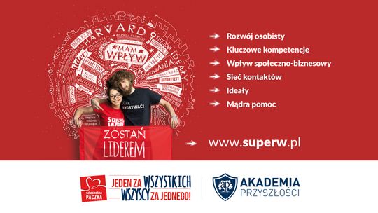 Rozwój osobisty, kluczowe kompetencje cenione na rynku pracy, wpływ społecznobiznesowy, sieć kontaktów, ideały, mądra pomoc. Jeżeli szukasz właśnie tego, to mamy dla Ciebie wyjątkową propozycję. Zostań Liderem SZLACHETNEJ PACZKI lub AKADEMII PRZYSZŁOŚCI. Zobacz, ile możesz zyskać na www.superw.pl