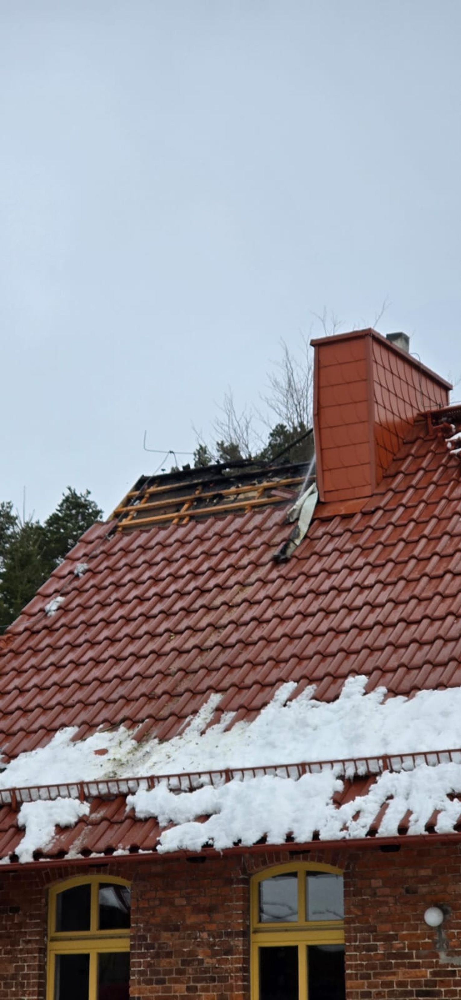 Po przybyciu na miejsce strażacy stwierdzili, że pożar rozprzestrzenił się na zewnątrz przez dach. Natychmiast podjęto działania polegające na zabezpieczeniu terenu i podaniu dwóch prądów wody w natarciu. Niezbędna była częściowa rozbiórka konstrukcji dachu oraz usunięcie pokrycia dachowego, aby powstrzymać rozprzestrzenianie się płomieni. Strażacy, przy użyciu podnośnika hydraulicznego, zabezpieczyli nadpalony dach plandeką, chroniąc wnętrze budynku przed dodatkowymi uszkodzeniami -mówi rzecznik prasowy PSP w Kościerzynie kpt.Mateusz Szmaglik