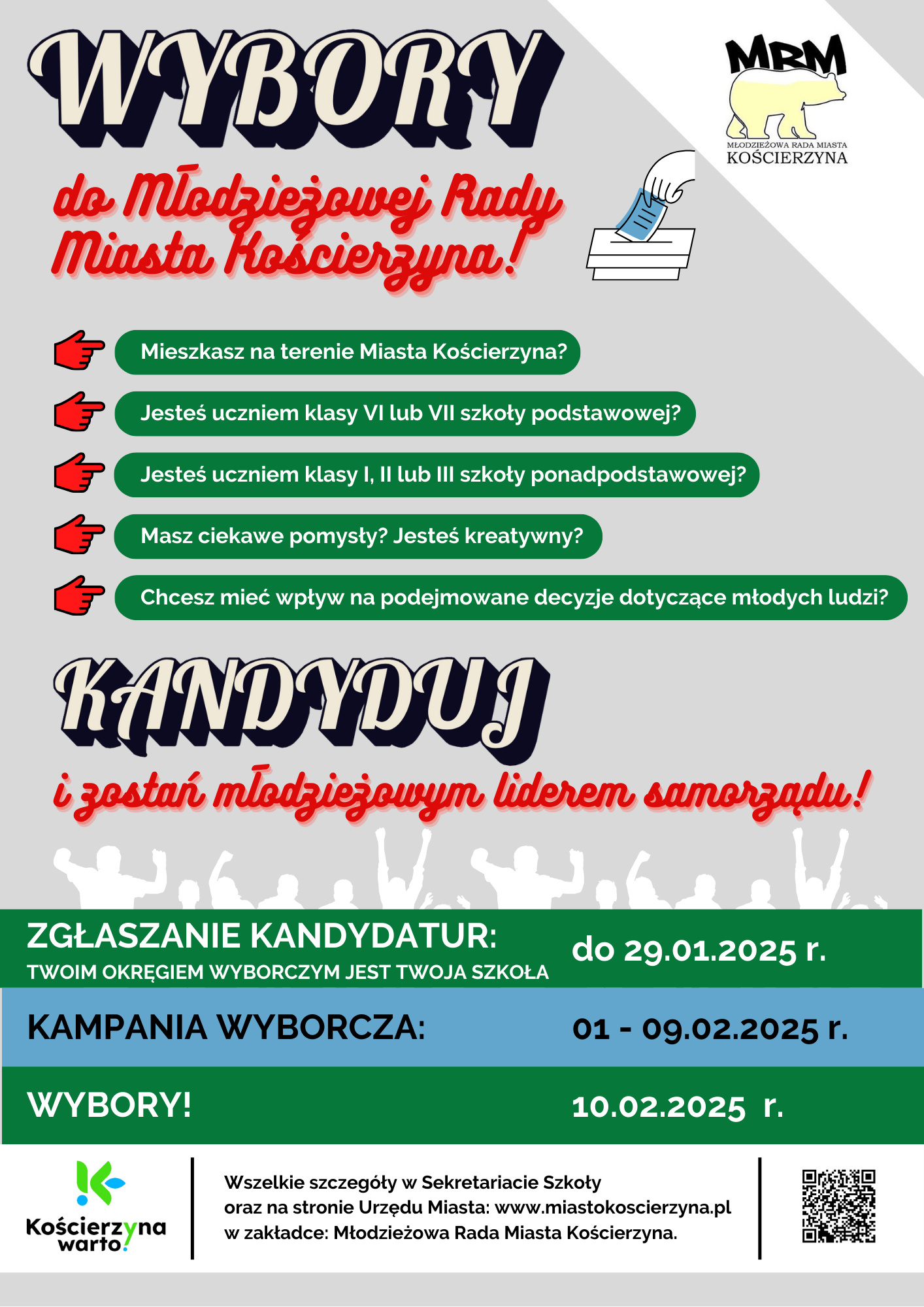 Każdy, kto zdecyduje się na kandydowanie, musi do 29 stycznia br. zgłosić swoją kandydaturę, popartą przez co najmniej 10 uczniów z własnego okręgu wyborczego, do funkcjonującej w każdej szkole Okręgowej Komisji Wyborczej, która odpowiada za organizację wyborów w szkole. Do 31 stycznia Miejska Komisja Wyborcza, powołana przez Burmistrza, opublikuje listy kandydatów, a w dniach 1-9 lutego przeprowadzona będzie kampania wyborcza kandydatów. Na 10 lutego zaplanowano przeprowadzenie wyborów, a do 13 lutego poznamy wyniki wyborów i tym samym skład Młodzieżowej Rady Miasta Kościerzyna V Kadencji.