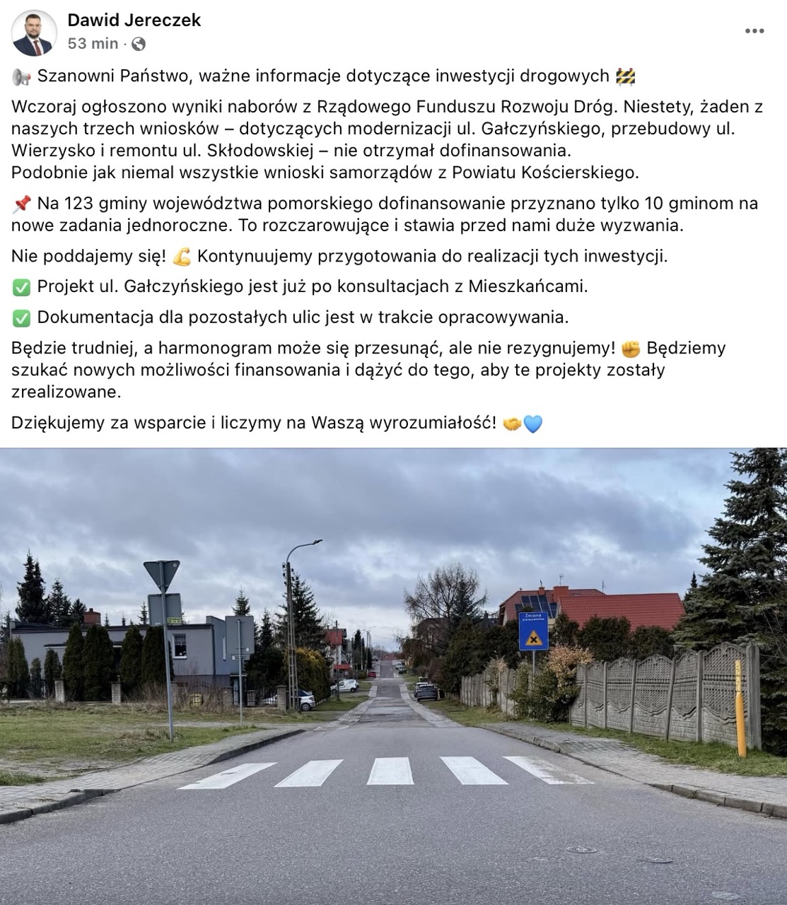 „Nie poddajemy się! Kontynuujemy przygotowania do realizacji tych inwestycji” – napisał burmistrz Kościerzyny. „Projekt ul. Gałczyńskiego jest już po konsultacjach z mieszkańcami, a dokumentacja dla pozostałych ulic jest w trakcie opracowywania.”