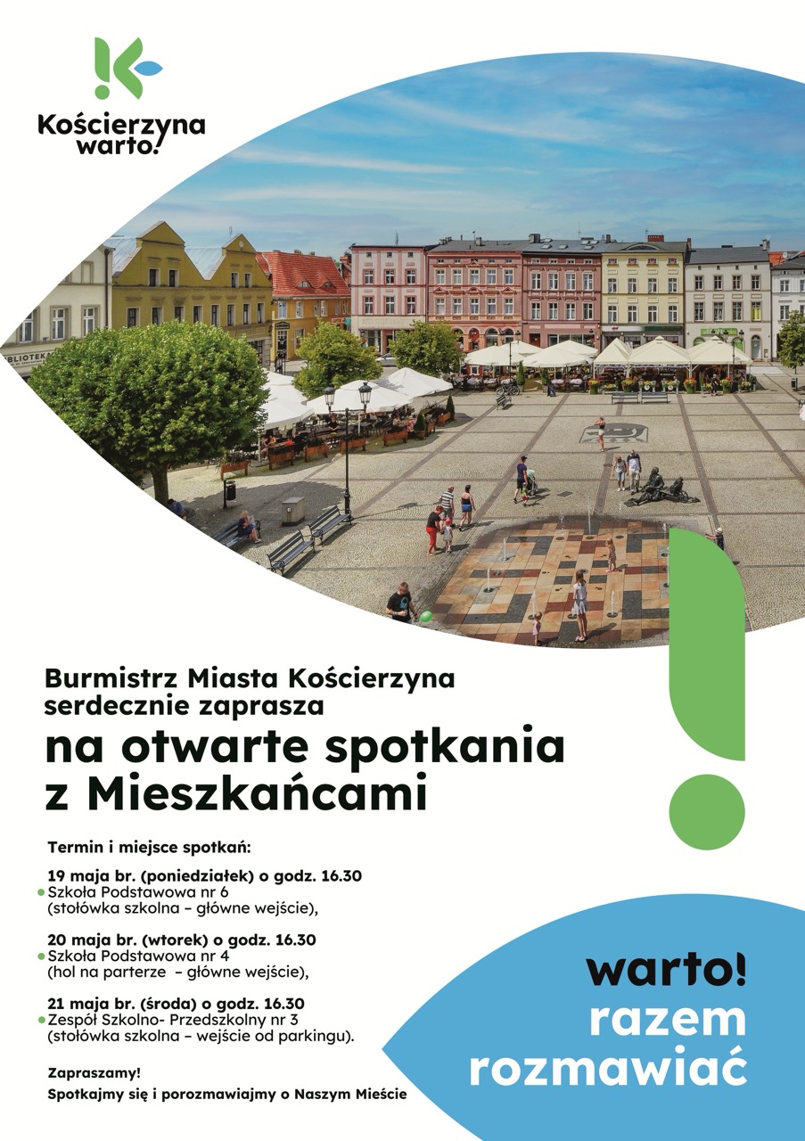 W dniach 19–21 maja Burmistrz Kościerzyny odwiedzi różne części miasta, by spotkać się z mieszkańcami. Szczegółowy harmonogram miejsc i godzin dostępny jest na plakacie.