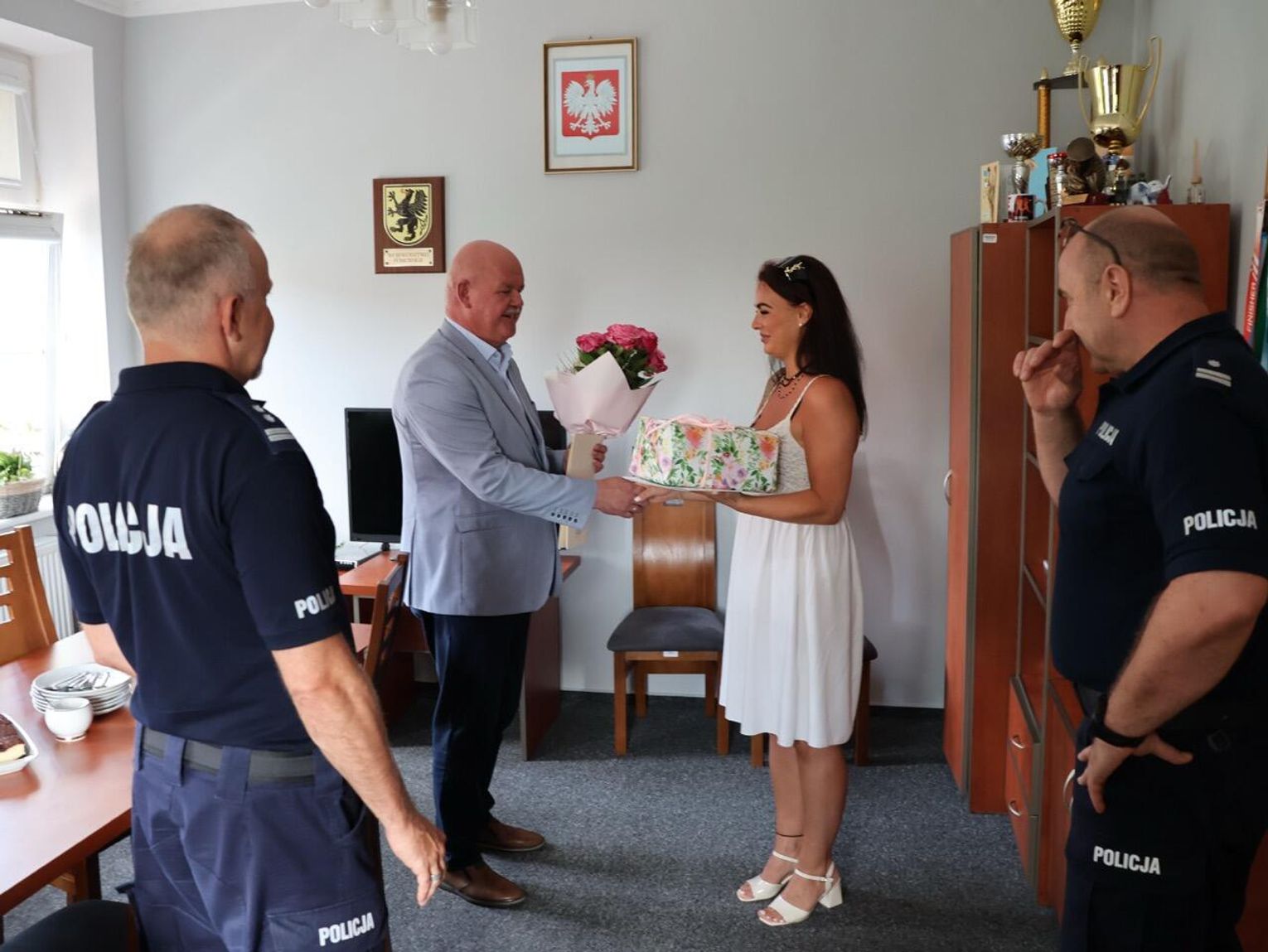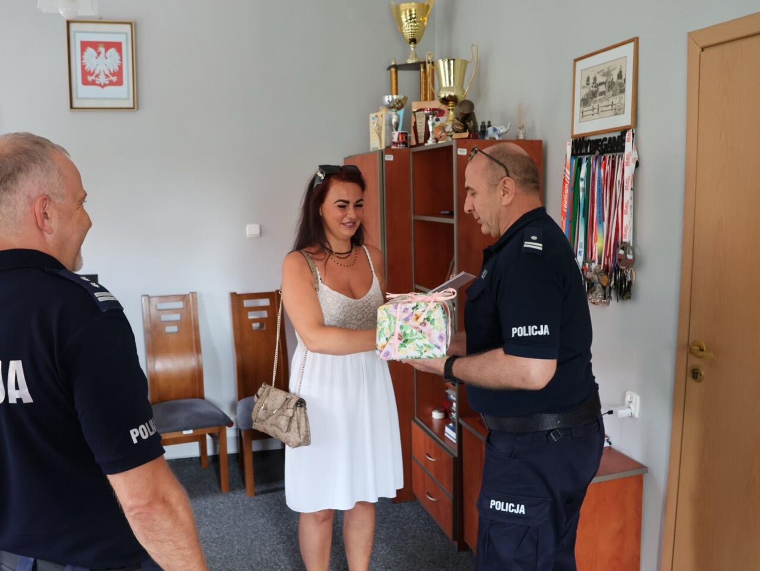 W budynku Komendy Powiatowej Policji w Kościerzynie odbyło się oficjalne wręczenie podziękowań dla pani Katarzyny. Komendant mł. insp. Radosław Kałaska, jego zastępca podinsp. Michał Domeracki oraz starosta Grzegorz Zabrocki wyrazili uznanie dla jej odwagi. Spotkanie zakończyło się symboliczną rozmową przy kawie i cieście.