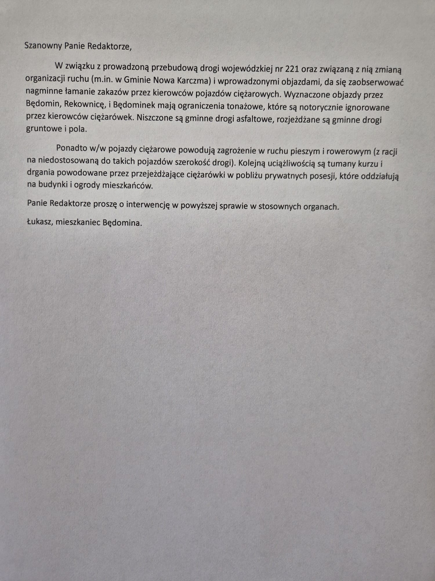 Pan Łukasz, w imieniu mieszkańców Będomina, zwraca się z prośbą o pilną interwencję odpowiednich organów. Problem wymaga natychmiastowego działania ze strony: