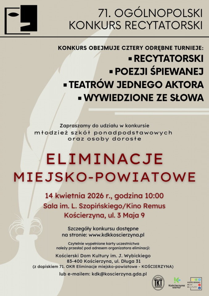 Eliminacje miejsko-powiatowe odbędą się 14 kwietnia (wtorek) o godz. 10:00 w Sali im. L. Szopińskiego (Kino „Remus"). Laureaci otrzymają możliwość startu w eliminacjach wojewódzkich.