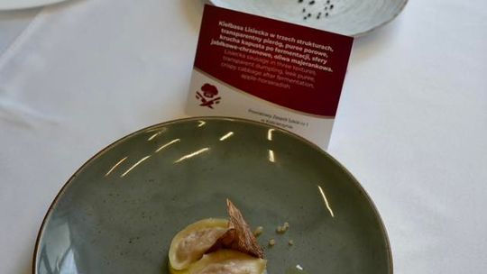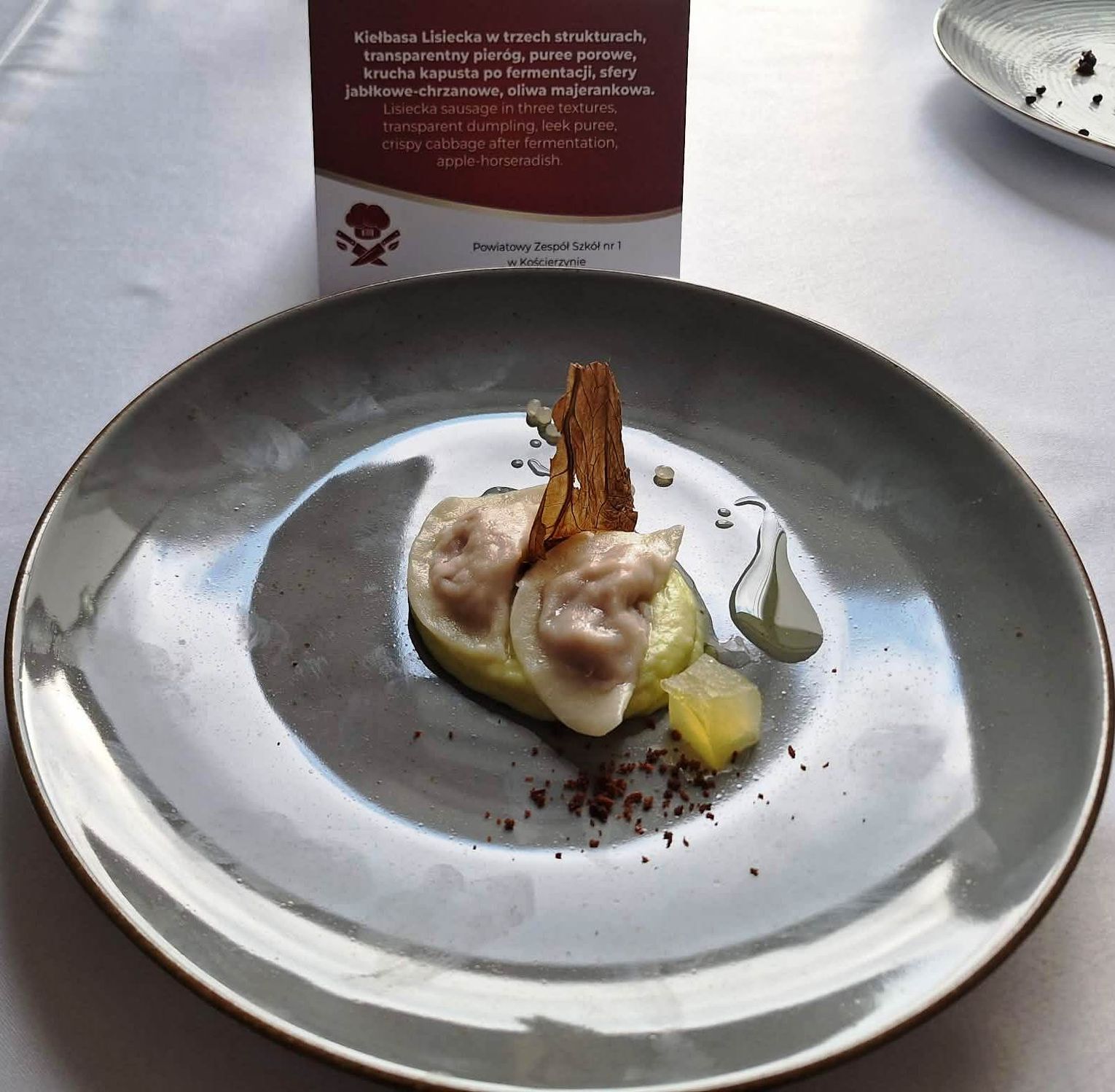 Danie główne stanowiło kontynuację tej innowacyjnej wizji. Kiełbasa lisiecka została zaprezentowana w trzech różnych strukturach: żelu, emulsji oraz pyle. Na talerzu towarzyszyły jej transparentny pieróg, puree z kiszonego pora, kruchy chips z fermentowanej kapusty oraz sfery jabłkowo-chrzanowe z oliwą majerankową.