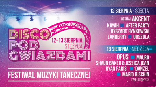 W tym roku również bawimy się pod gołym niebem na terenie stężyckiego amfiteatru. Na scenie DISCO POD GWIAZDAMI wystąpią największe gwiazdy spod znaku muzyki rozrywkowej. AKCENT, AFTER PARTY, URSZULA, KAYAH, RYSZARD RYNKOWSKI, LANBERRY, OPUS, NAURO, SHAUN BAKER & JESSICA JEAN, RYAN PARIS, DANZEL, MARIO BISCHIN – i to jeszcze nie wszyscy artyści, których możemy się spodziewać! Agencja odpowiedzialna za organizację i produkcję tego wydarzenia – STARS OF POLAND, naprawdę zadbała o to, abyśmy nawet przez chwilę nie poczuli znużenia.